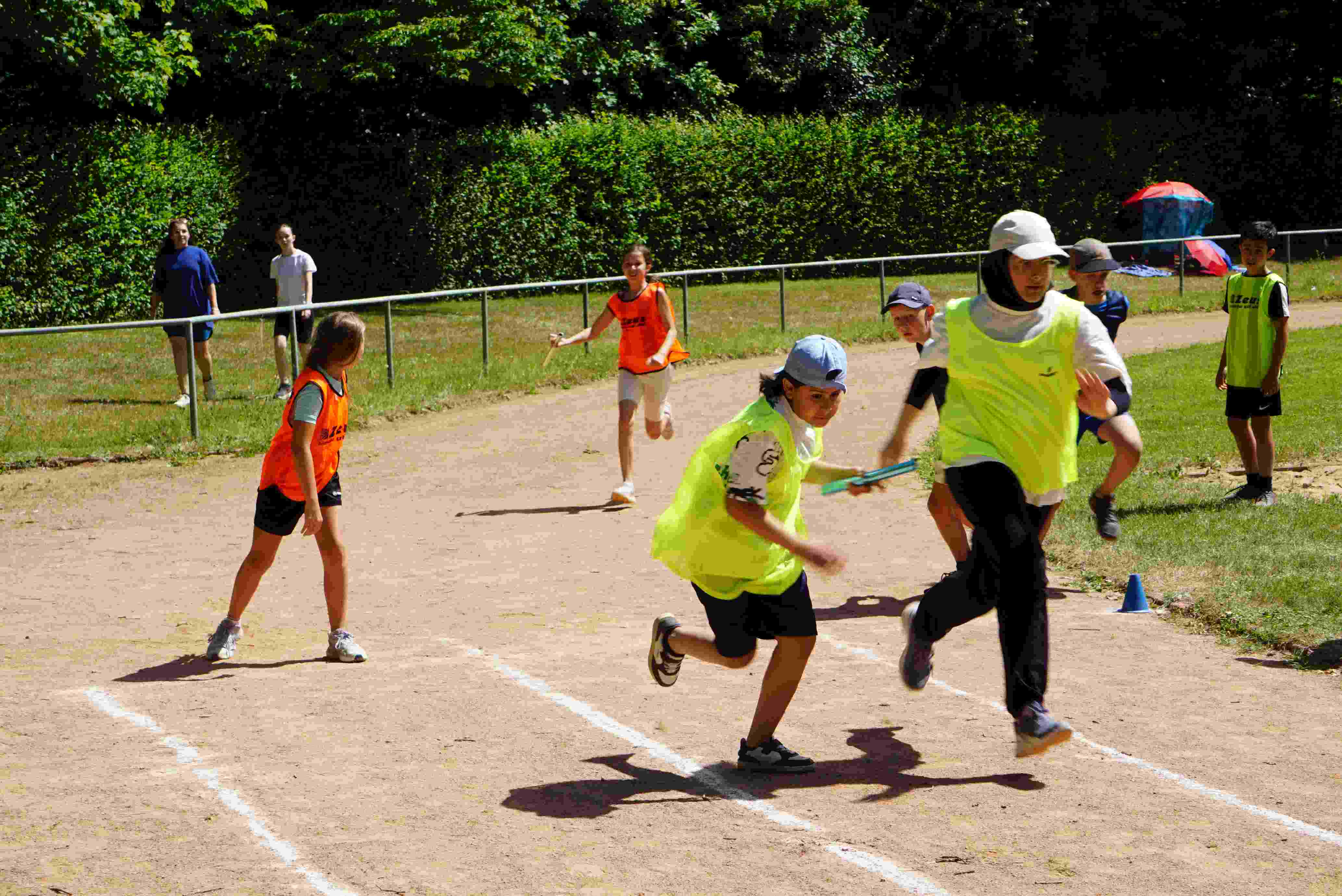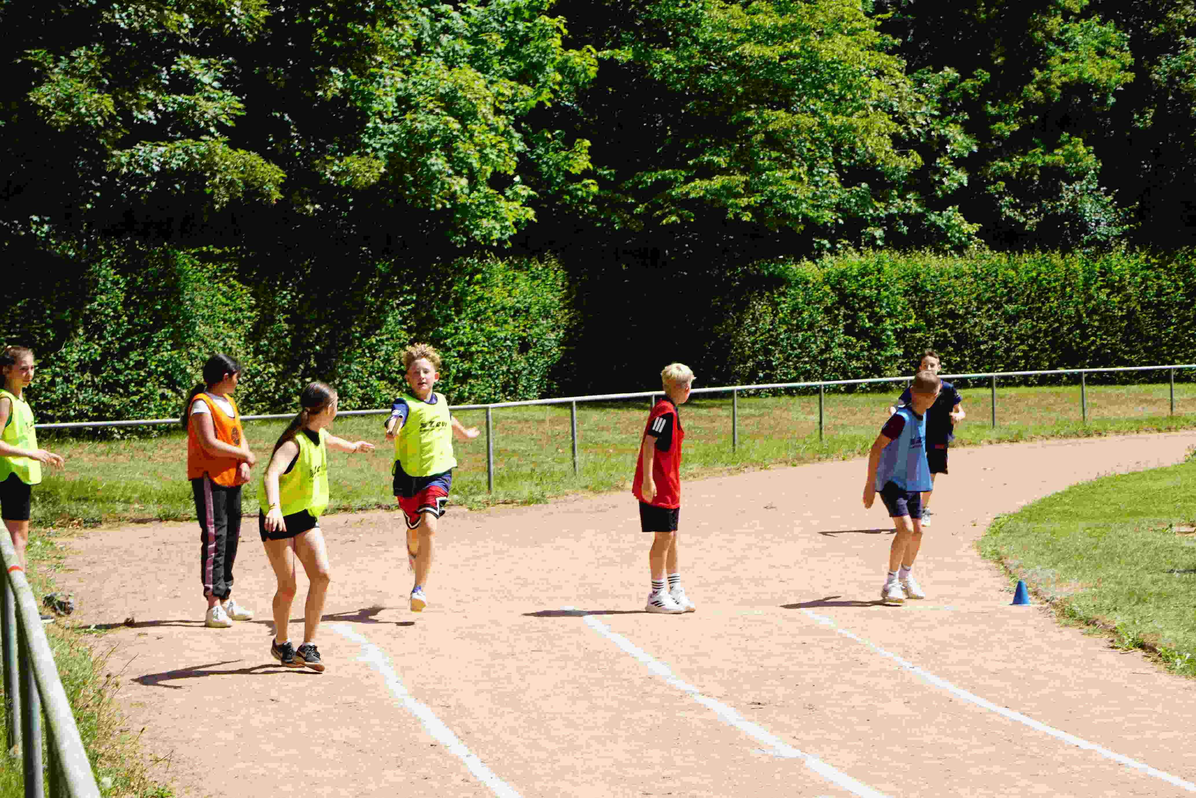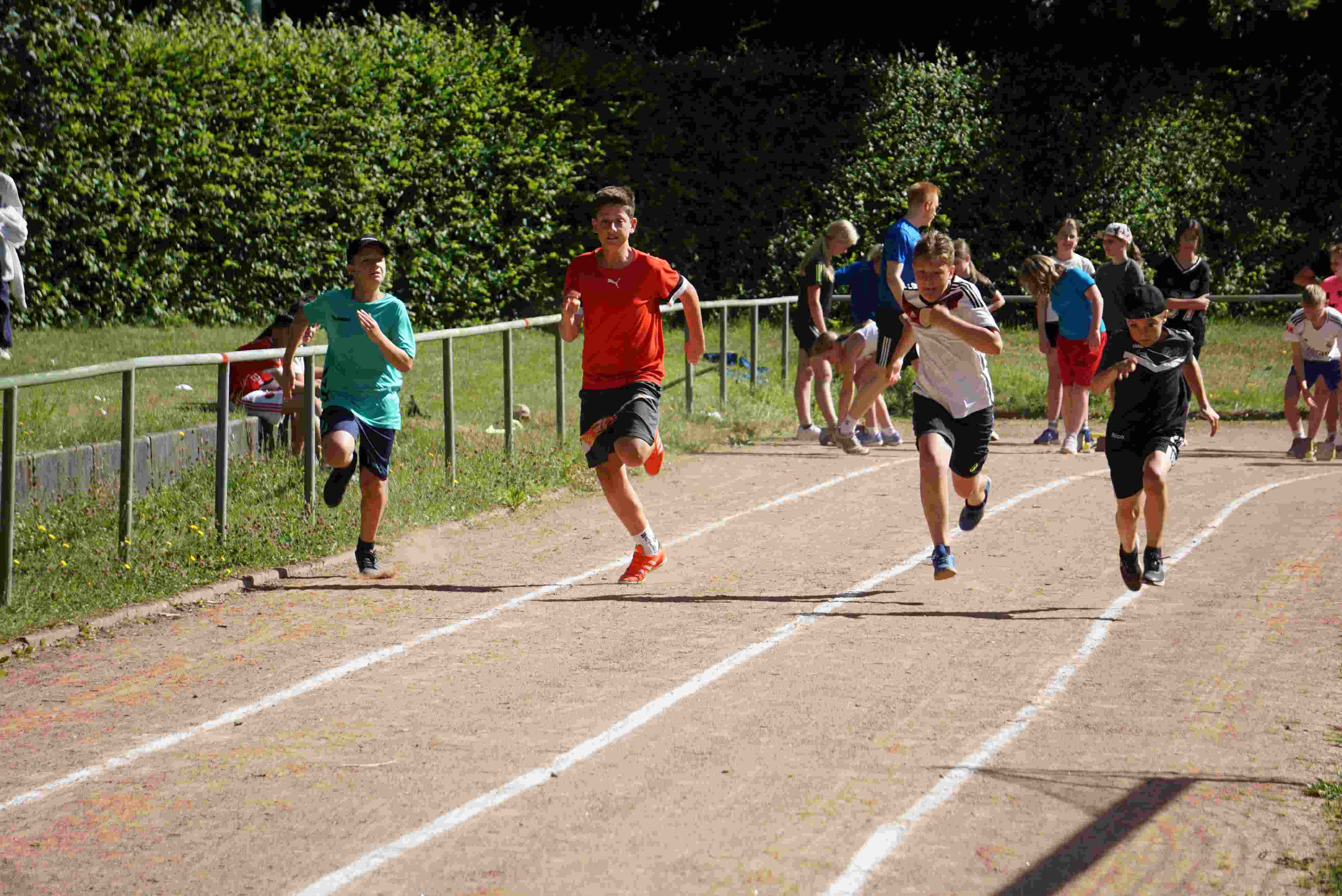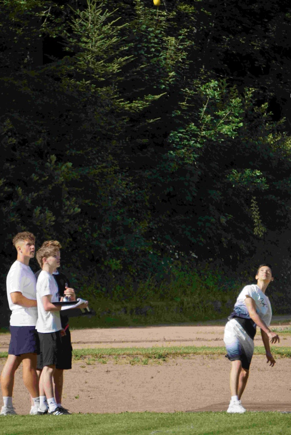 Der erste Termin musste noch witterungsbedingt ausfallen, aber nun war es soweit: Bei strahlendem Sonnenschein trafen sich alle 5.-7.Klässler auf dem Raustein zu den diesjährigen Bundesjugendspielen. Gegen die anschwellende Hitze hatte man extra Sonnenschirme, einen kleinen Pavillon und sogar ein größeres Zelt aufgebaut, für die gute Laune beschallte Thomas Kuhner von der Tonstudio-AG den Platz mit Musik. Zu den Klängen von „Bella Napoli“ begann das lockere Aufwärmen mit kleineren Gymnastikeinlagen, bevor man sich in drei großen Jahrgangskreisen endgültig locker machte. Dann gingen die Klassen, angeleitet von ihren Staffelführer*innen des Lk Sport und Geographie, zum Startpunkt ihrer ersten von drei Disziplinen, die wie immer aus Werfen, Springen und Laufen bestanden. Zum großen Finale traten die Jahrgänge zum Staffellauf an, der in diesem Jahr aus einem 16 x 50m-Lauf bestand, wie immer bestens kommentiert von Benjamin Schöwe. Im ersten Lauf konnte sich die 5b durchsetzen, den zweiten gewann die 6a und den dritten die 7a. Herzlichen Glückwunsch!