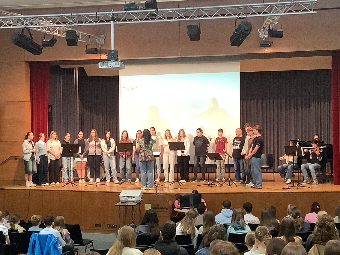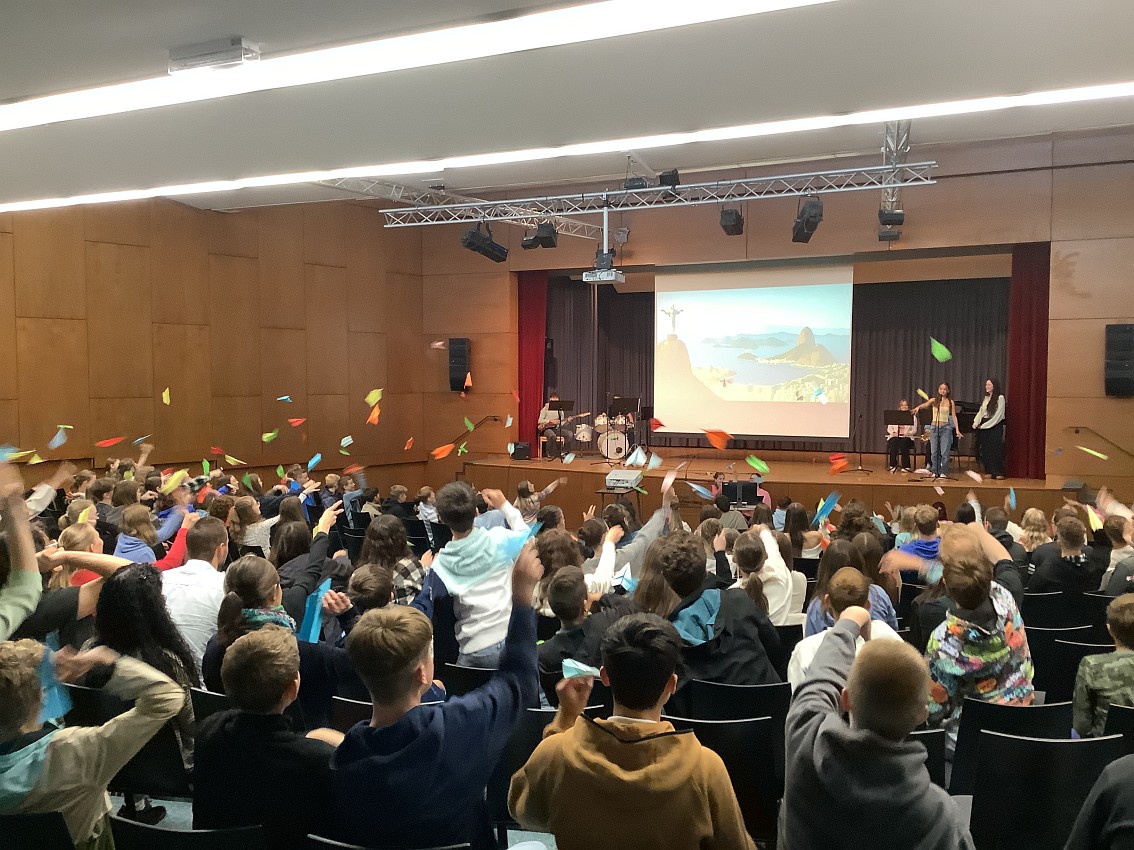 Der diesjährige Schuljahresendgottesdienst stand unter dem Motto „Endlich Ferien – mit Blick auf Brasilien“, symbolisiert Brasilien doch viele Sehnsüchte, die sich in der Urlaubszeit erfüllen sollen: Sonne, Strand, Farbenpracht, unberührte Natur, Lebensfreude. Dass wir auch in dieser Zeit den Segen Gottes bedürfen, darin erinnerte – der Christusstatue über Rio gleich – der Gottesdienst, der wie in den vergangenen Jahren vom Leistungskurs Religion gestaltet wurde. Hier ließen einige Lehrkräfte per Videoeinspieler die schönen, aber auch die belastenden Momente des letzten Schuljahres Revue passieren, hier hatten die Schülerinnen und Schüler die Möglichkeit, ihre Wünsche und Hoffnungen zu Papier zu bringen. Musikalisch unterstützt wurde der Gottesdienst vom Leistungskurs Musik und einem Schüler-Lehrer-Chor und am Ende hatten alle Gottesdienstbesucher die Gelegenheit, ihre Wünsche und Hoffnungen in Form eines Papierfliegers aufsteigen zu lassen, bevor sie vielleicht selbst demnächst einen Flieger besteigen werden.