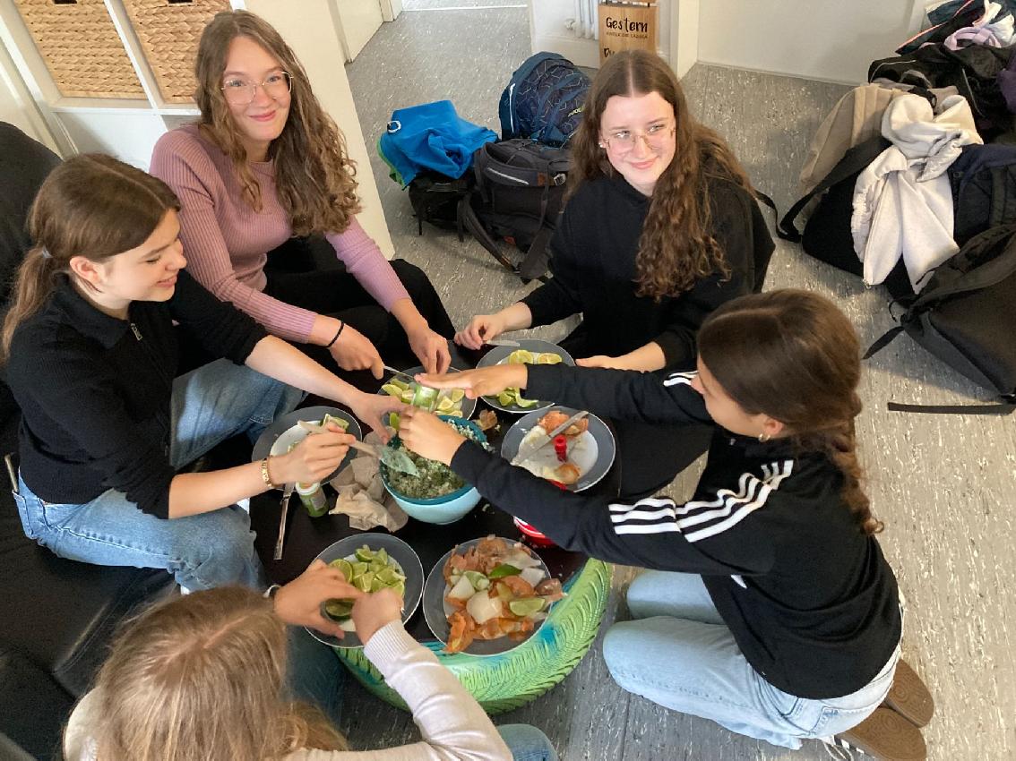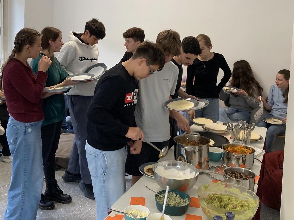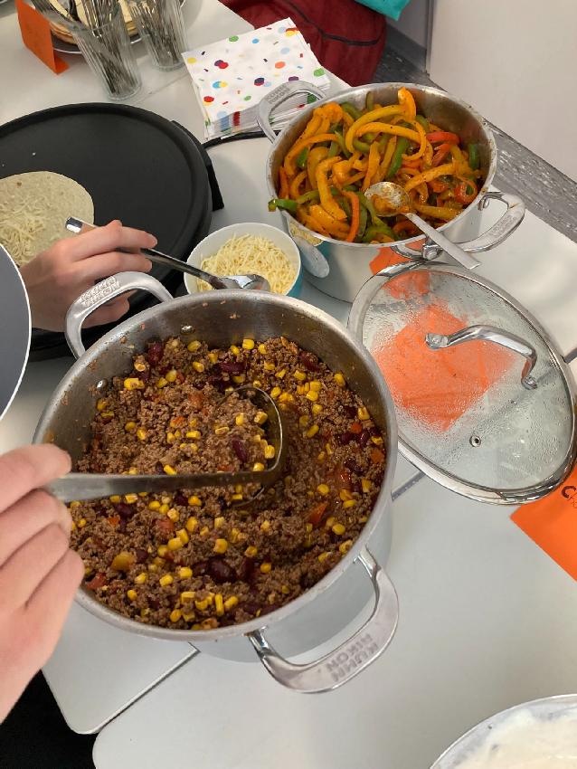 In zuvor eingeteilten Kleingruppen wurde nach festen Arbeitsplänen geschnippelt, gebraten und gemixt. Ob Guacamole zubereiten, Gemüse schneiden, Fleisch anbraten oder den Raum für 30 hungrige Personen herrichten – alle halfen mit vollem Einsatz mit, sodass am Ende ein äußerst leckeres Ergebnis auf den Tellern landete.