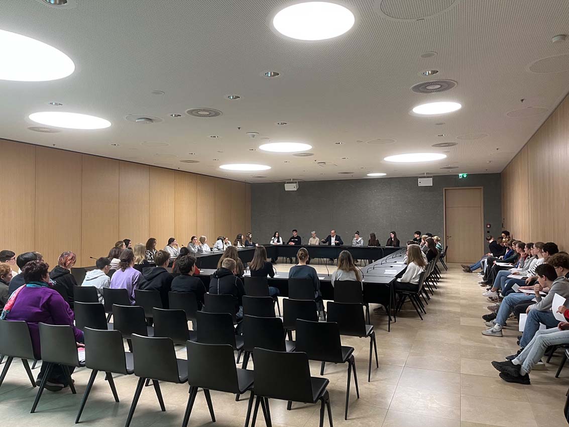 Am 20. Februar 2025 sind die neunten Klassen gemeinsam mit Sabine Geng, Elmar Moosmann und Nicola Brudy nach Stuttgart zur Besichtigung des Landtags gefahren. Nachdem die Schüler*innen eine kleine Einführung bekommen hatten, sind alle gemeinsam in den Plenarsaal gegangen. Hier waren die Schüler*innen Teil eines Rollenspiels, bei dem Parlamentsabläufe simuliert wurden. Auch gab es einen kleinen Vortrag eines Referenten. Anschließend bekamen die Schüler*innen die Möglichkeit, zwei Landtagsabgeordneten Fragen zu stellen. Neben dem Direktabgeordneten Stefan Teufel (CDU) aus dem Wahlkreis Rottweil war auch die Grünen-Abgeordnete Catherine Kern aus dem Wahlkreis Hohenlohe anwesend. Die Abgeordneten nahmen sich sehr viel Zeit, sodass die Schüler*innen viel von der Veranstaltung mitnehmen konnten. Nach einem kurzen Aufenthalt in der Stuttgarter Innenstand ging es mit dem Bus zurück nach Schramberg.