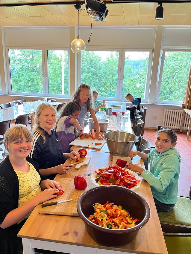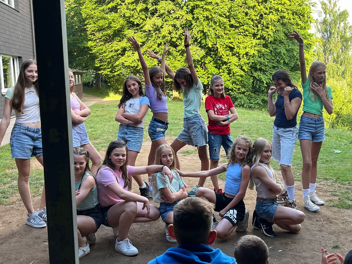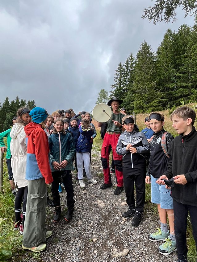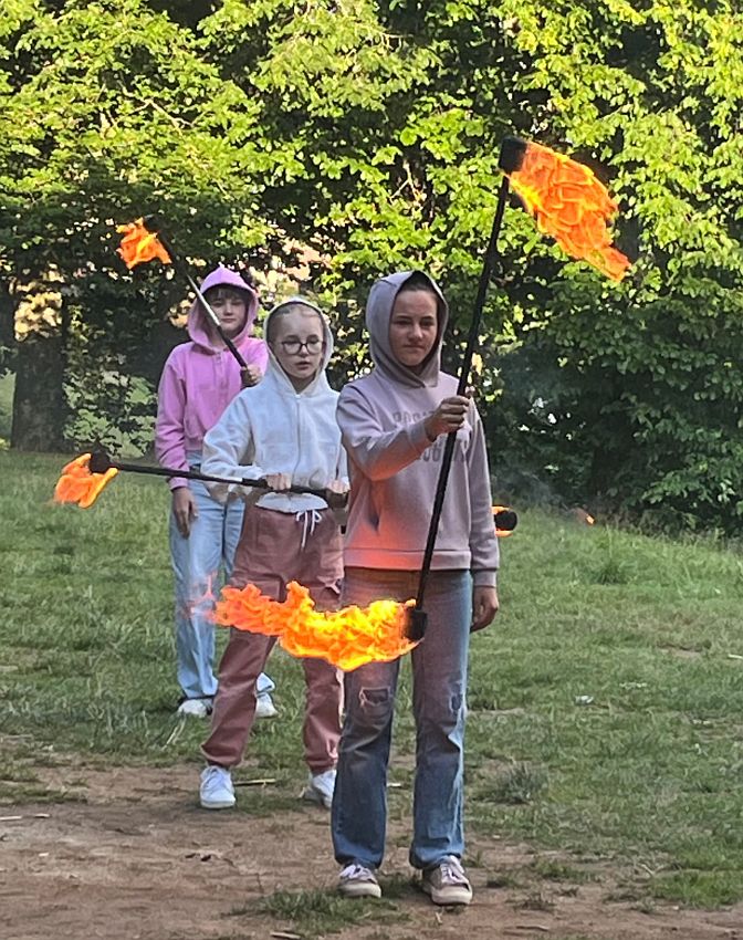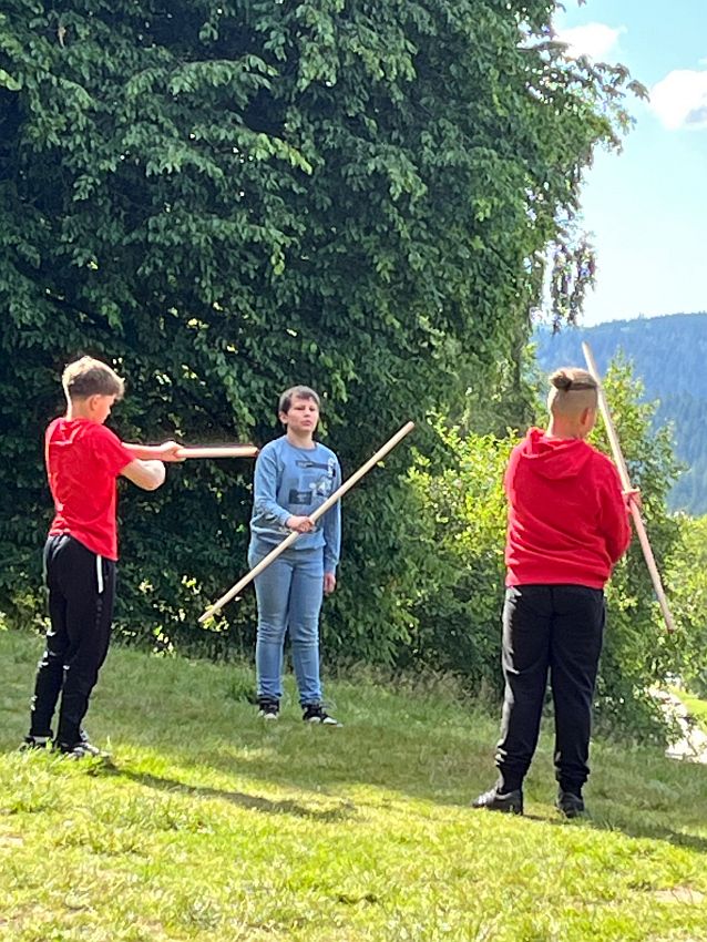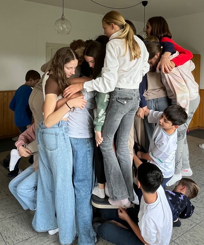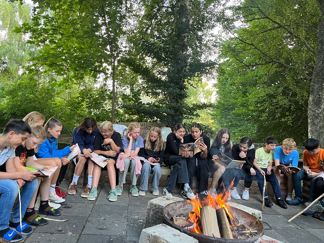 Es war 8 Uhr, als wir am Montag, dem 07.07.2025 zu unserem Schullandheim aufbrachen. Unser Schullandheim lag in Bernau, das ist in der Nähe vom Titisee. Die Fahrt zum Haus der Balance dauerte zwei Stunden. Als wir um ca. 10 Uhr ankamen, regnete es ein bisschen. Wir brachten unsere Koffer in den Aufenthaltsraum, wo uns schon unsere Teamer, also unsere Betreuer, erwarteten. Bevor wir die Zimmer bezogen, spielten wir ein Hausspiel, bei dem wir Kerzen und Zettel mit einem Liedtext drauf suchen mussten. Am Abend gab es Käsespätzle und um 21 Uhr mussten wir uns bettfertig machen. Um 22 Uhr war dann Nachtruhe. Am nächsten Tag durften wir uns zwei Workshops aussuchen. Außerdem gab es jeden Morgen einen Morgenkreis, genannt Morningpower, und einen Abendkreis. Am dritten und vierten Tag gingen wir nach dem Frühstück und dem Morningpower in unsere ausgesuchten Workshops. Es gab die Workshops Tanzen, Theater, Kreativ, Traumfänger, Basteln, Waldläufer, Schnitzen, Kochen, Feuerstab und alles rund um den Stock. Da wir ein Selbstversorgerhaus waren, gab es Küchendienste. Am letzten Abend gab es Vorführungen von den Workshops Tanzen, Theater und Feuerstab. Als es dunkel wurde, saßen wir um ein Feuer und aßen Bananen und Stockbrot. Da kam auch schon der Abfahrtstag und wir mussten das Haus in den Zustand bringen, wie wir es am ersten Tag angetroffen hatten. Um 11 Uhr fuhren wir ab und kamen um 12.45 Uhr am Gymnasium an. Wir umarmten glücklich unsere Eltern.