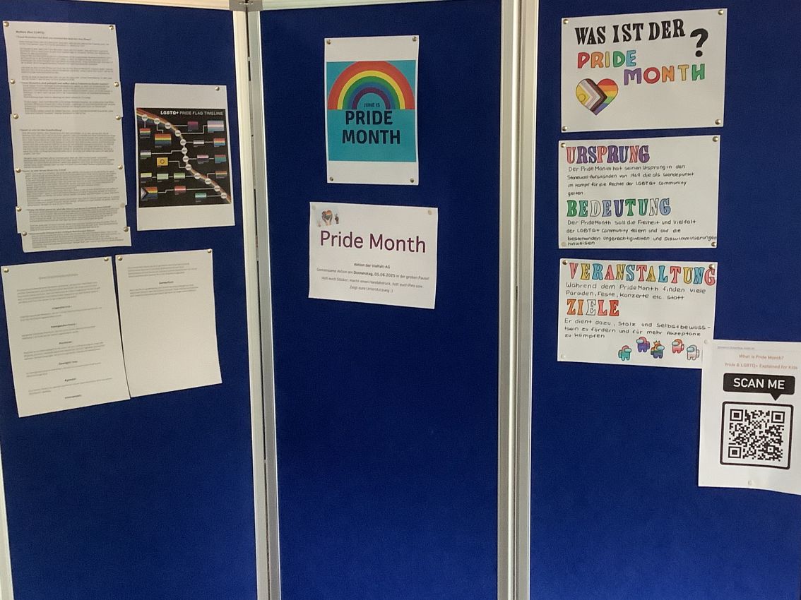 Auch an unserer Schule setzt die Vielfalt-AG ein Zeichen: Im Foyer findet ihr eine kleine Ausstellung, die erläutert, was der Pride Month überhaupt ist, spannende Einblicke in die Geschichte queeren Lebens in Deutschland gibt, Begriffe erklärt, Zahlen und Fakten vorstellt und Wege gezeigt, wie jede*r ein*e Ally sein kann – also eine unterstützende Person, die sich solidarisch zeigt, ohne selbst queer zu sein.