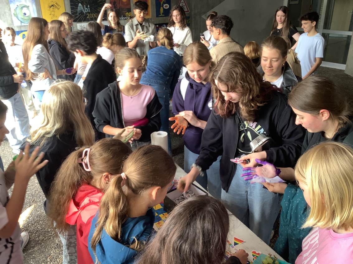 Am 05.06. fand in der Pause eine Aktion statt, bei der jede*r „Farbe“ bekennen und so Unterstützung zeigen konnte. Ebenso wurden Pins und Sticker ausgegeben, mit denen man jeden Tag seine Unterstützung zeigen kann.