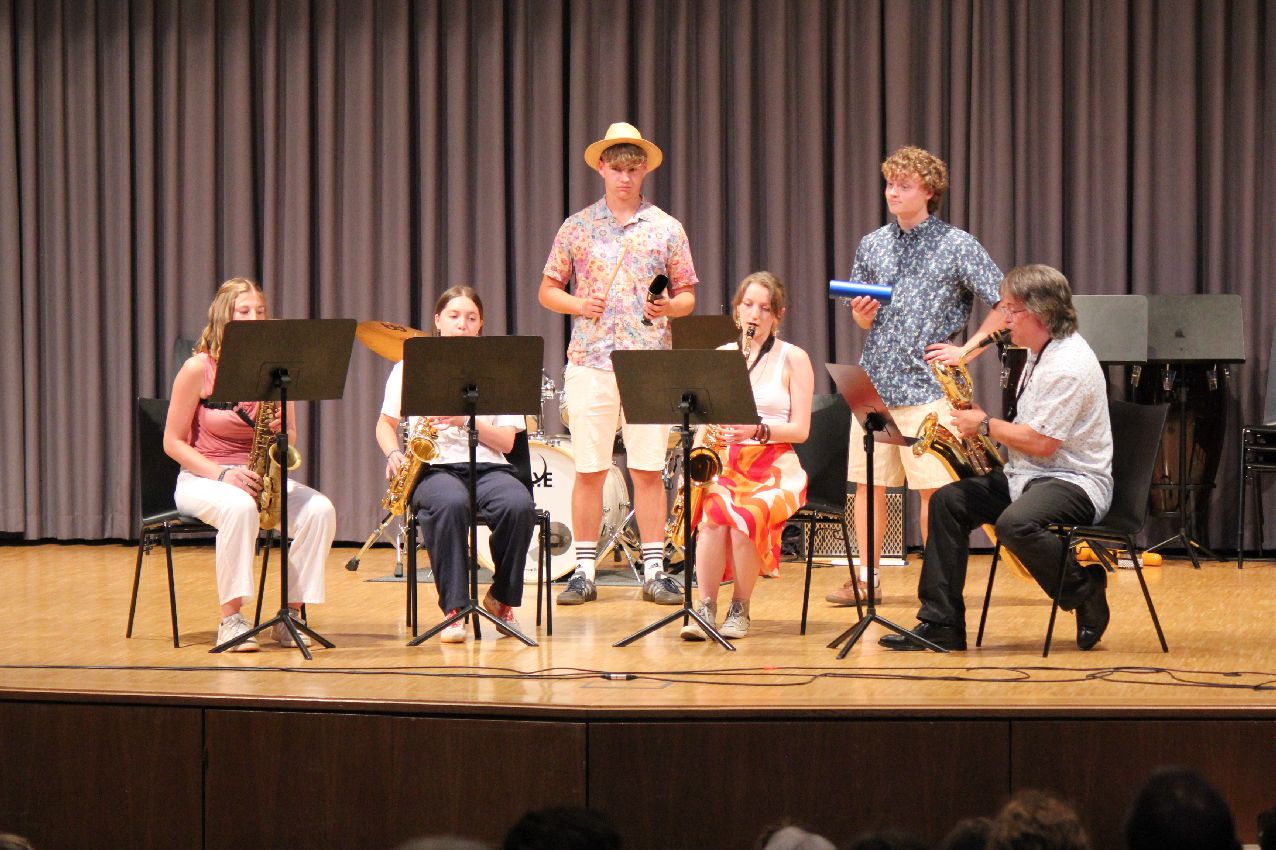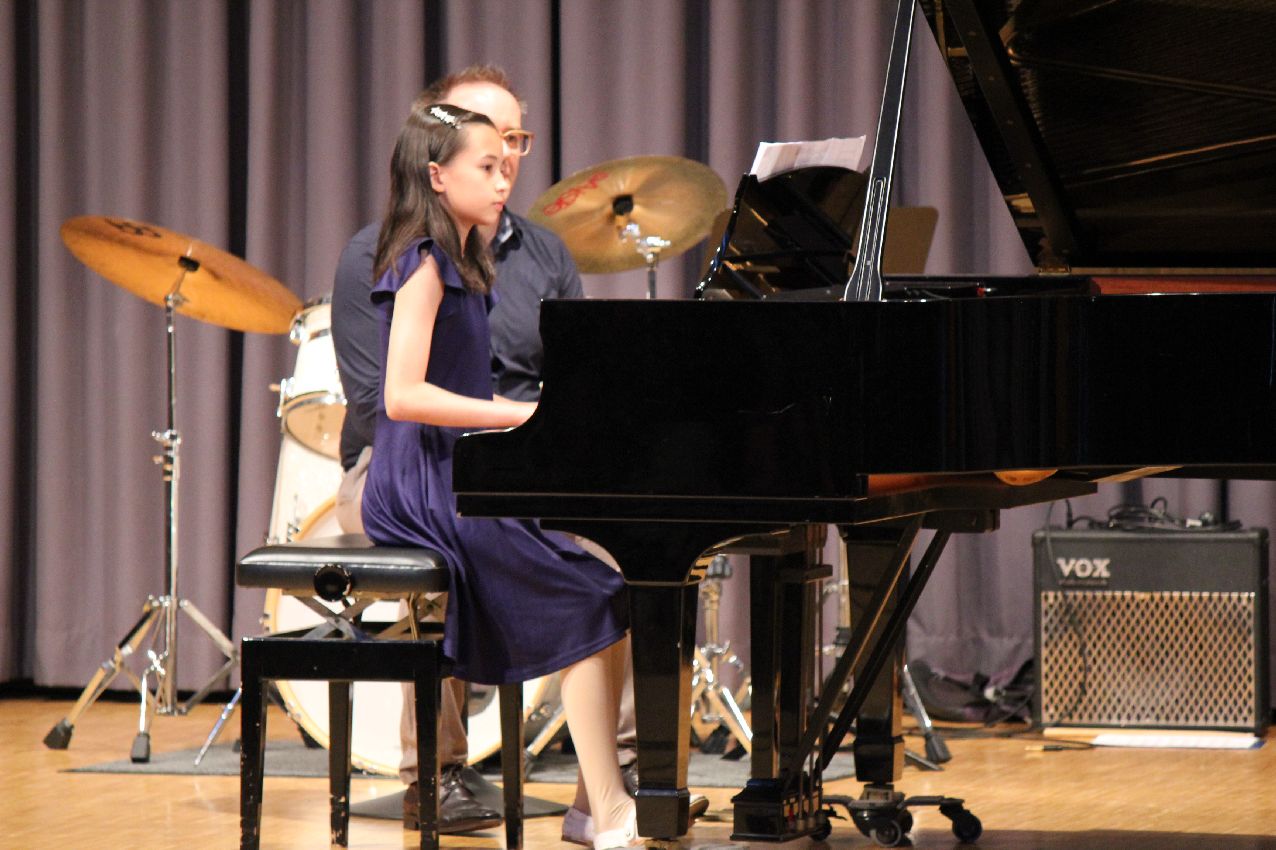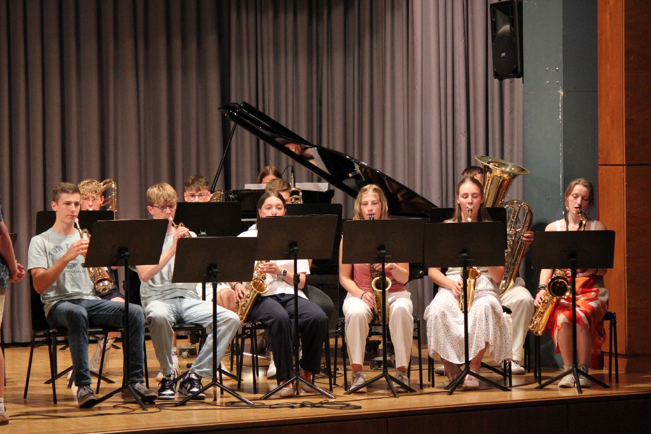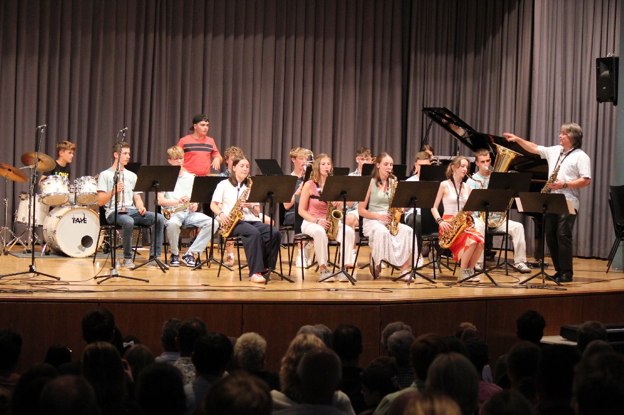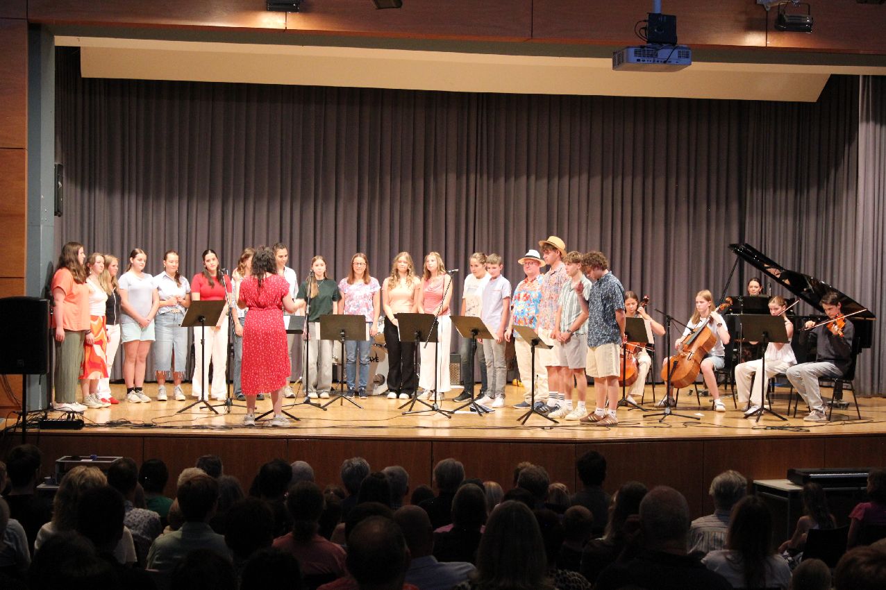 wurden von den Schülerinnen und Schülern so beschwingt und federleicht vorgetragen, dass sich beim Publikum Sommergefühle einstellten. Danach setzte sich Josephine Auber ans Klavier. Sie hatte beim diesjährigen Landeswettbewerb „Jugend musiziert“, dem höchsten Wettbewerb ihrer Altersklasse, die höchste Punktzahl erreicht und zeigte nun, warum. Mit dem Allegro und dem Andante von J.S.Bachs „Italienisches Konzert in F-Dur“ verzauberte sie das andächtig lauschende Publikum, dass von ihrem einfühlsamen Klavierspiel in den Bann gezogen wurde. Der Leistungskurs Musik der Jahrgangstufe 11 entfachte dann mit seinen drei Darbietungen die Sehnsucht nach Karibikstränden („A Coconut named Alex“), Streifzügen durch heimische Wälder („Das Wandern“) und die unbeschwerte Beatles-Zeit („Can´t buy me love“). Die gleiche Lebensfreude versprühte anschließend der Schulchor des Gymnasiums, der unterstützt wurde durch ein eigens hierfür zusammengestelltes Streicherquartett. Nachdem Coldplays „Viva la Vida“ verklungen war, leiteten die Big Band das Finale ein. Schon die Titel ihrer Stücke „Havanna“, „Smooth“ und „Happy“ zeigten die Stimmung an, die sie nun verbreitete. Dermaßen in Urlaubslaune versetzt, klatschte das Publikum begeistert mit, als die Big Band mit allen Chören des Abends „Hakuna Matata“ anstimmte. Mit Standing Ovations bedankten sich alle Gäste für diesen wundervollen Abend, der der perfekte Einstieg war für die anstehenden Sommerferien.