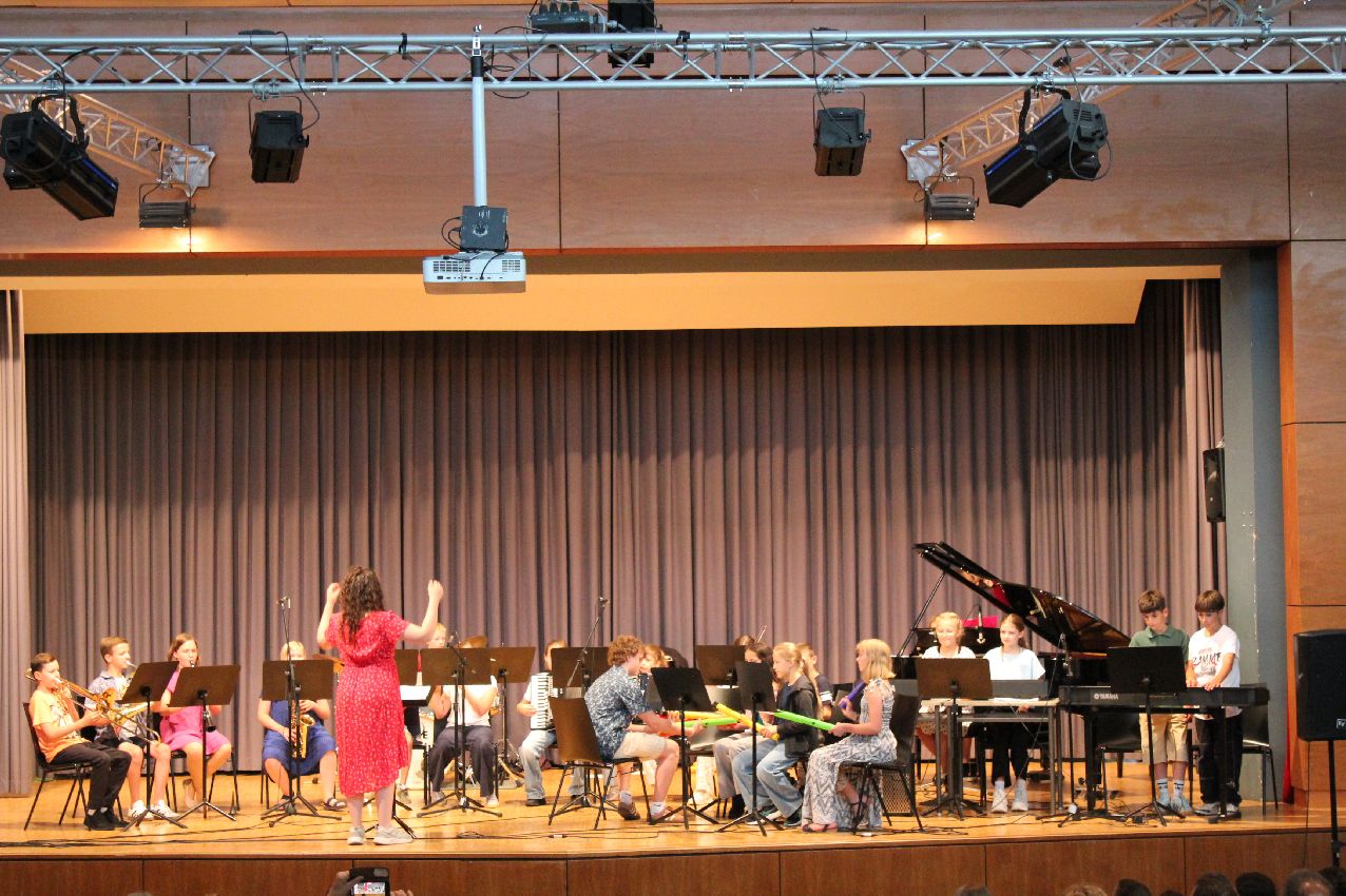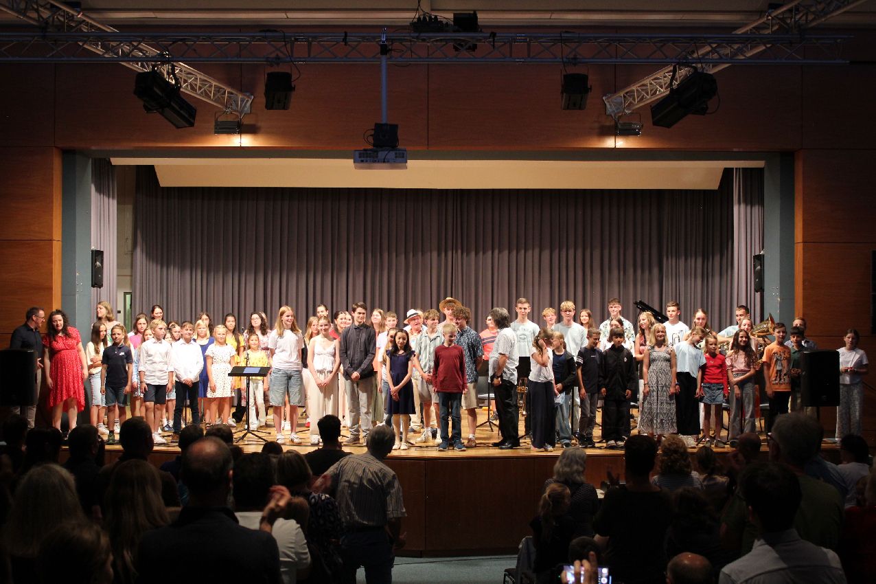 Unter dem Motto „Hakuna Matata“, bekannt aus „Der König der Löwen“, stand das diesjährige Sommerkonzert, das erste nach der Coronapause. Und dass die zahlreichen Besucher des Konzerts ihre Probleme wenigstens für kurze Zeit vergessen werden, das versprach Johannes Romer in seiner Begrüßung, der ein Novum folgte: Bevor die Musiklehrer*innen Stefanie Flaig, Mirjam Hauser, Thomas Kuhner und Johannes Romer die verschiedenen Gruppen dirigierend oder instrumental durch den Abend begleiteten, begrüßten sie selbst musikalisch die Gäste mit Billy Joels „For the longest time“. Das Klassenorchester der 5a begeisterte anschließend das Publikum mit „Dance Monkey“ dermaßen, dass der ganze Saal rhythmisch mitklatschte und tosend applaudierte. Danach betrat der Chor der 5. und 6. Klassen singend die Bühne. Vier Stücke, französisch, englisch, deutsch,