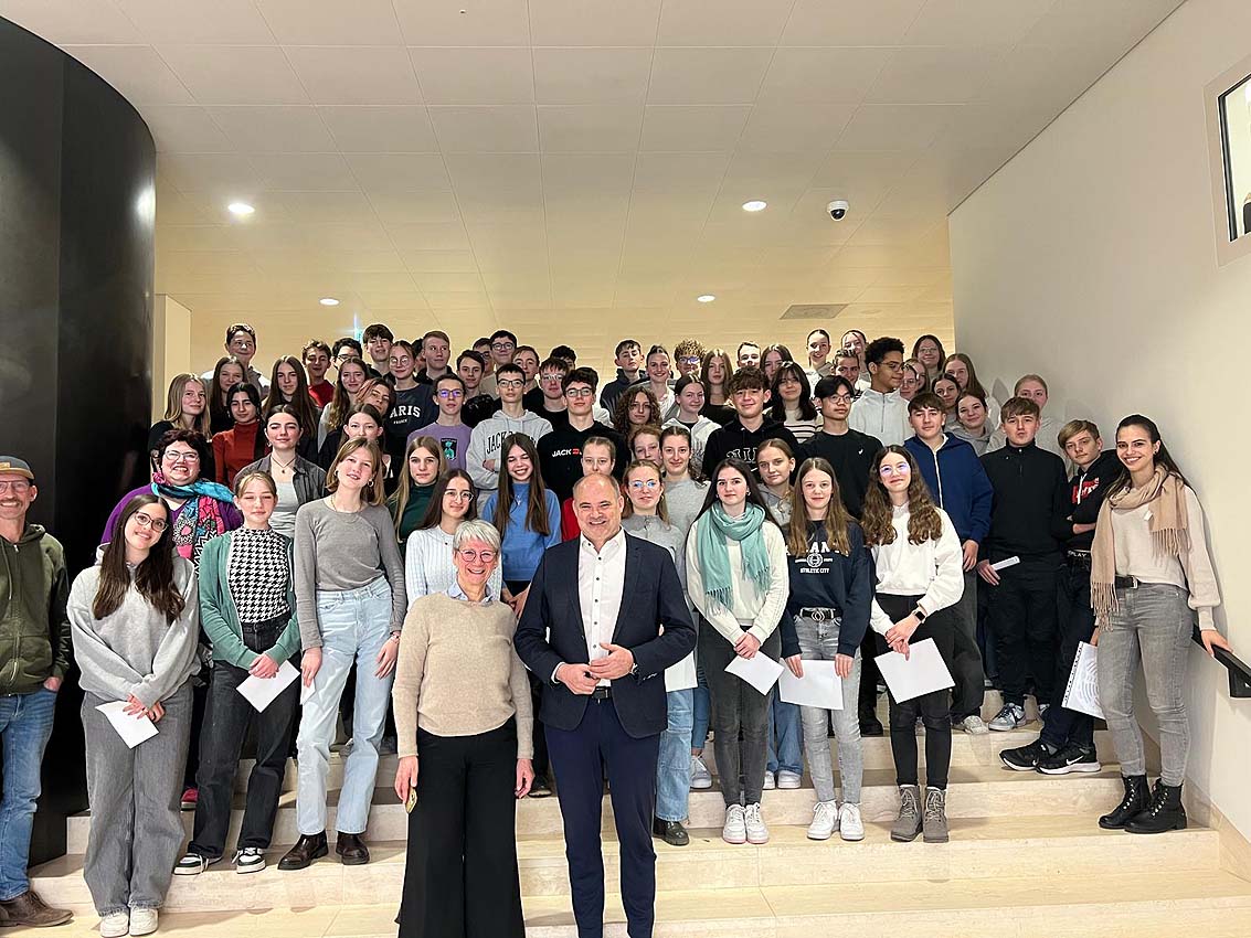 Weiterlesen...Am 20. Februar 2025 sind die neunten Klassen gemeinsam mit Sabine Geng, Elmar Moosmann und Nicola Brudy nach Stuttgart zur Besichtigung des Landtags gefahren. Nachdem die Schüler*innen eine kleine Einführung bekommen hatten, sind alle gemeinsam in den Plenarsaal gegangen. Hier waren die...