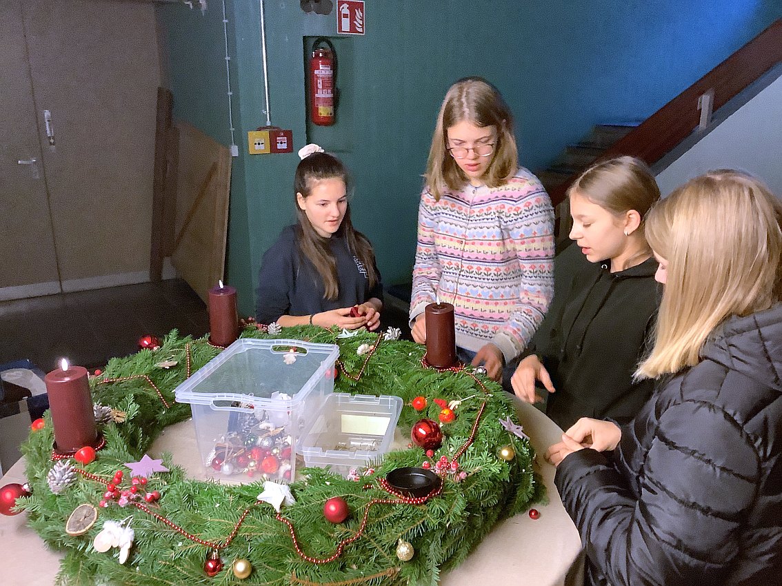 Weiterlesen...Die Adventszeit hat begonnen und in unserer Schule breitet sich langsam vorweihnachtliche Stimmung aus. Seit dem ersten Advent leuchtet bereits die erste Kerze auf dem Adventskranz, der in diesem Jahr liebevoll von Nora Hezel, Clarissa Jurschik, Franziska Noak und Emma Peñalver aus der 7a...