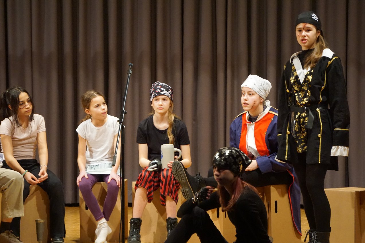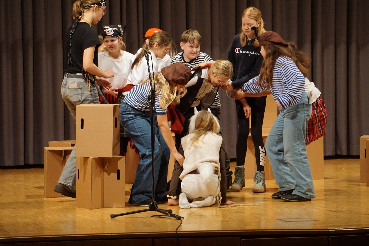 Ein Baby in einem Waschzuber mitten auf dem Meer? Was sollen die Piraten unter dem Kommando von Kapitän Klaas damit anfangen? Gegen Lösegeld verkaufen? Aber dann findet die Besatzung des Piratenschiffes das Baby doch zu süß, taufen es mit einer Suppenkelle auf den Namen Moses und ziehen es, obwohl ein Mädchen, selbst heran. Nicht wissend, in was für ein Abenteuer sie dieses Baby ziehen wird. Als es sich, inzwischen ein junges Mädchen, heimlich mit ihrer Ziege wegschleicht, wird es prompt entführt und landet ausgerechnet beim gefürchteten Piraten Olle. Der hofft, über sie an den Blutroten Blutrubin des Verderbens zu gelangen, den Heiligen Gral der Piraterie. Vor dem großen Showdown in der Halle des Königspaares müssen neue Freundschaften geschlossen, Fluchtpläne geschmiedet und Rätsel gelöst werden. Erst vor dem royalen Paar wird das Geheimnis um das Findelkind gelüftet, die Geschichte vom Blutroten Blutrubin des Verderbens erzählt und alle Verwicklungen entflechtet. Alle diese turbulenten Ereignisse nach dem Kinderbuch von Kirsten Boie brachte die Theater-AG der Unterstufe unter der Leitung von Frau Hilt und Frau Ganter mit sehr viel Spielfreude und Humor auf die Bühne. Nicht nur die schauspielerische Leistung überzeugte, auch die Kostüme waren mit viel Liebe zum Detail gestaltet worden. Hier gab es alles: Neben den Piraten Höflinge, das Königspaar, Ritter, aber auch eine Ziege, einen Raben und Bäume. Komplettiert wurde die Aufführung von der Tonstudio-AG, die die Umbaupausen musikalisch untermalte und für die Geräuschkulisse sorgte. So wurden die angereisten Grundschüler aus den umliegenden Schulen aufs Beste unterhalten, wofür sich diese bei dem Ensemble mit viel Applaus bedankten.